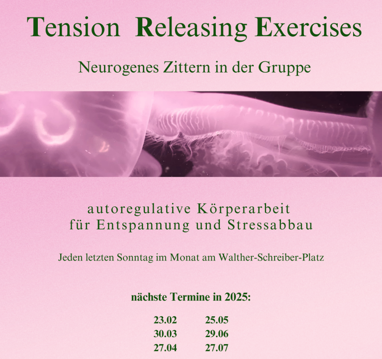 Nach einer kurzen Einführung zur Funktion des neurogenen Zitterns und der Geschichte des TRE, gehen wir gemeinsam durch die vorbereitenden Übungen und laden dann neugierig beobachtend zum Zitterprozess ein. Sei nicht enttäuscht, wenn Dein Körper nicht gleich loszittert, er tastet sich vielleicht erst einmal vorsichtig an diese neue Erfahrung heran und schaut, ob er den neuen Bewegungen auch wirklich vertrauen kann.